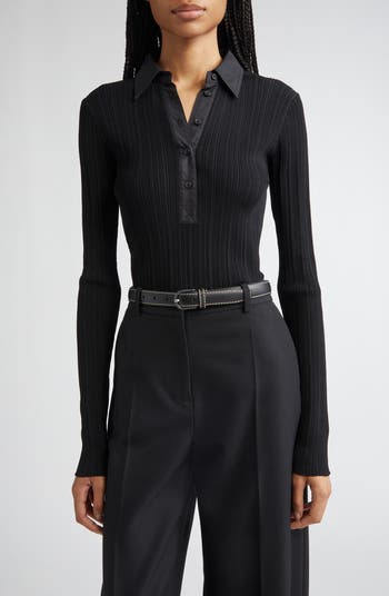 A refined button half placket and contrast accents elevate the sporty aesthetic of this long-sleeve polo, while sculpting ribbed knitwork defines its figure-flaunting silhouette.