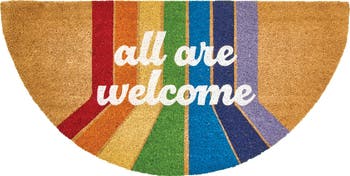 Bring color and whimsy to your doorstep with the mDesign West Welcome Doormat. The half-round silhouette fits neatly against any doorway and is adorned with a vibrant rainbow and the words "All are Welcome", an inviting phrase that sets the tone for your home. Its fade-resistant dyes keep its vibrancy, making it ideal for the porch, deck, or patio. Suitable for any high-traffic area, the coir material is incredibly functional and is designed to scrape dirt off footwear, keeping your floors clean and dry. The non-slip vinyl backing firmly anchors the mat in place, making it suitable for both indoor and covered outdoor areas while coordinating with your home's aesthetic.