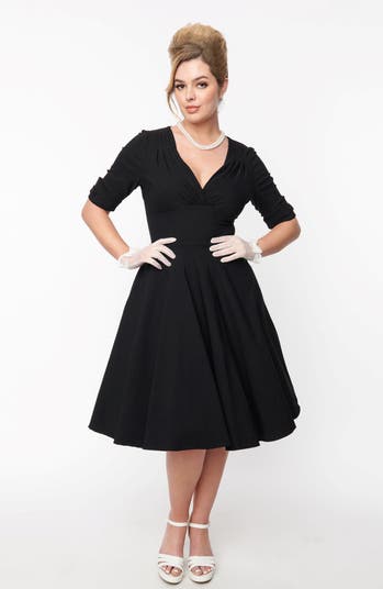 The Delores Swing Dress is a 1950s-inspired beauty that features a gathered surplice V-neckline and tailored half sleeves. The thick banded waistline and knee length A-line swing skirt creates a flattering silhouette. While its soft pleats and back zipper are just the perfect finishing touches.