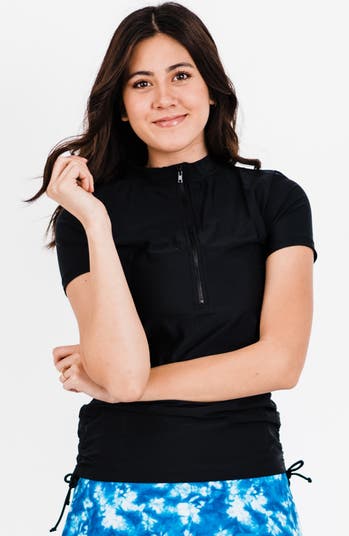 Dive into comfort with our Half-Zip Adele Swim Top. Loose fit, short sleeves, and a modern mock neckline. Designed to be worn over your favorite swim bra for flexibility and style. Flattering side ruching, UPF 50+, 1/2 zip closure. Quick dry for beach-ready style. Size up for the perfect fit.