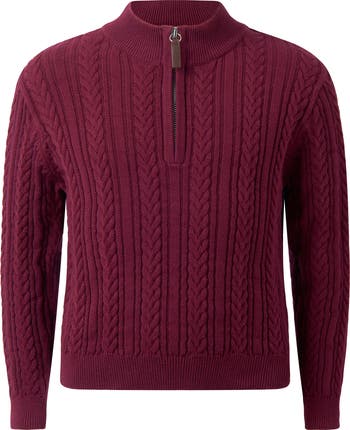 Elevate your little one's wardrobe with our boys' Half-zip Cable Knit Sweater in burgundy. With a sleek and versatile design, this sweater is perfect for dressing up or down. The elegant cable knit pattern adds a touch of sophistication to any outfit. Layer over a t-shirt or classic collared shirt for a smart look.