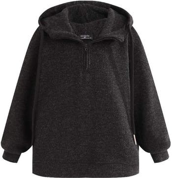 This dark gray pullover sweatshirt combines cozy fleece comfort with a relaxed, oversized fit. Featuring a half-zip front and drawstring hood, it’s a versatile staple for lounging, layering, or laid-back outings. Puff-cuffed sleeves and loose silhouette offer extra warmth and ease of movement. Soft fleece interior keeps you snug without feeling bulky.