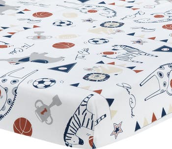 This fun sports themed breathable 100% cotton fitted crib sheet features a combination of baseballs, basketballs, footballs, and soccer balls along with the athletic all-star animal team of lions, giraffes, zebras, and elephants. It has elastic all the way around for a safe and secure fit on a standard size crib mattress measuring 52” X 28”.