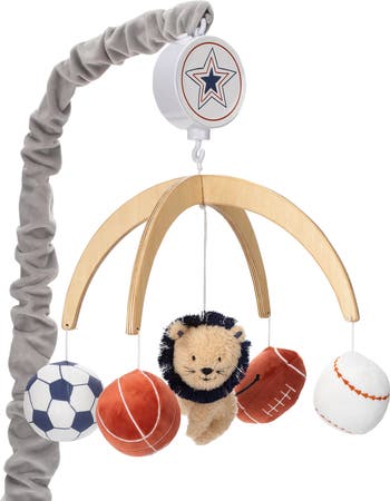 This unique musical crib mobile soother toy has custom-designed crossed wooden arches along with four embroidered soft plush sports balls (football, baseball, soccer ball, and basketball) and a soft 5” plush lion made from a sandy-colored boucle fabric. The music box is covered with a star and the scrunchie, which covers the mobile arm, is a light gray velour. This mobile plays nursery songs for 20 minutes, has an on/off switch and volume control. It plays Twinkle Twinkle Little Star, Brahms Lullaby, and Rock a Bye Baby. Requires 3 AAA batteries, not included. This is a great way to help soothe your little one to sleep. This mobile is a top baby registry pick and makes a great baby shower or welcome home baby gift.