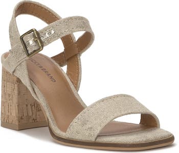 A cork-textured block heel amplifies the earthy style of this versatile ankle-strap sandal.