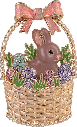 This gold tone woven Easter basket pin is packed with festive fun! Featuring a sweet bunny surrounded by delicate flowers, and a cute bow on top, it’s the perfect accessory to celebrate spring, Easter, or just add a little whimsy to your outfit. Pin it on your jacket, bag, or hat and carry a little basket of joy wherever you go!