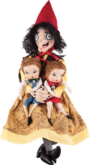 - Standing 36 inches tall, this handcrafted folk art doll figurine showcases a charming Halloween character inspired by Hansel & Gretel’s old hag. Its detailed attire and expressive design bring unique personality to seasonal home displays.