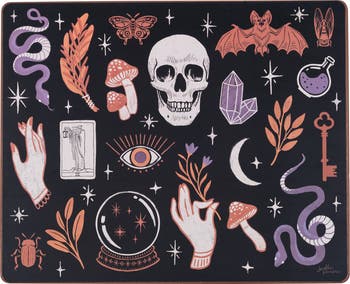 - Features an enchanting mix of moons, skulls, serpents, and celestial symbols. The balanced black-and-white artwork blends seamlessly into witchy, gothic, or fall-inspired settings, creating a bold yet refined tabletop statement.