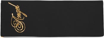 Angel or not, you can play the role with this slim, rectangular leather clutch punctuated with polished script hardware.