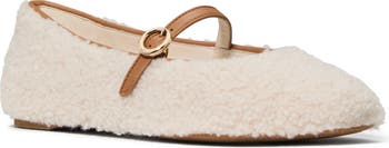 Logo-etched hardware secures the slim leather mary-jane strap of this square-toe flat all done up for the season in genuine shearling.