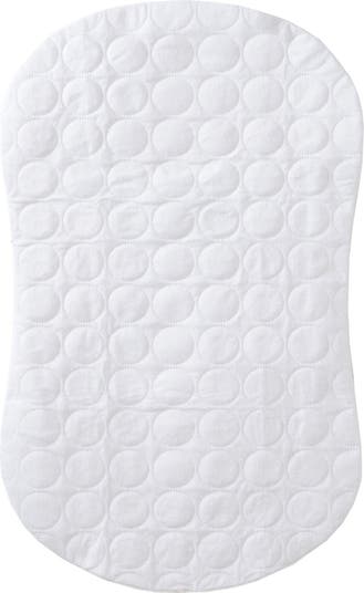 A waterproof mattress pad with a triple-layer design is made in an hourglass shape that fits the Halo Innovations Bassinest Bedside Swivel Sleeper mattress.