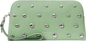 Glossy studs and a signature logo highlight the finely grained leather exterior of a slim clutch featuring an optional wrist strap for on-the-go convenience.