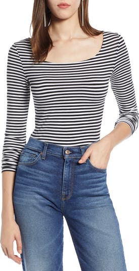I got the black and white stripped top and it's so so cute! Ballet neck necklines are very flattering on anyone. I did size up to a large I'm normally a medium in most of Nordstrom's tops. The fit is perfect and you cannot see through the black and white stripped top.
