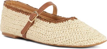 Smooth trims and a V-cut topline highlight the woven raffia upper on a boho-cool flat fastened by an adjustable mary jane strap for secure wear.