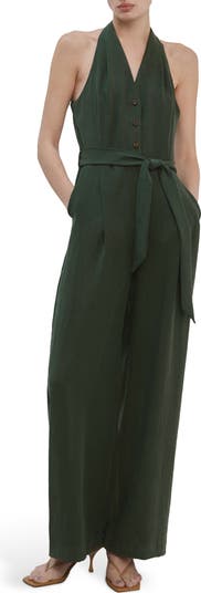 Elegant and easy, this flowing jumpsuit features a shoulder-framing halter neck, a waist-defining tie belt and a shirt-style front button closure.