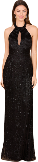 Tulle fabric sleeveless halter neck dress. Open back with invisible central zipper. Embellished all over with seed beads and sequins.