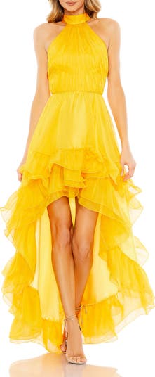 Mac Duggal Halter Neck Pleated Ruffle Tiered High Low Gown, Main, color, Gold