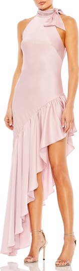 Introducing our Halter Neck Ruffled Asymmetrical Gown, featuring cascading ruffles and a sophisticated halter neckline. The asymmetrical hemline adds contemporary flair for any formal event.