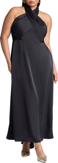 A crossover halter neck enhances the showstopping elegance of a smooth satin gown fashioned with a cinched waist and ankle-grazing hem.