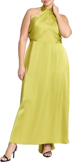 A crossover halter neck enhances the showstopping elegance of a smooth satin gown fashioned with a cinched waist and ankle-grazing hem.
