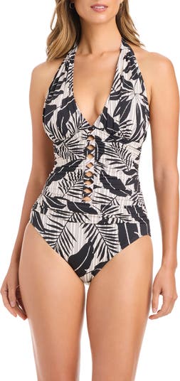 Catch compliments poolside or seaside in this halter one-piece swimsuit fashioned with flattering ruching that molds to your shape.