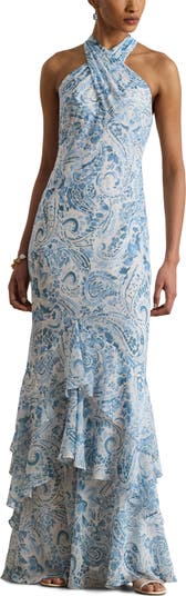 An elegant inkblot paisley design decorates this stunning maxi dress styled to captivate with a wrapped halter neckline, gently fitted bodice and floor-grazing skirt trimmed with cascading ruffles.