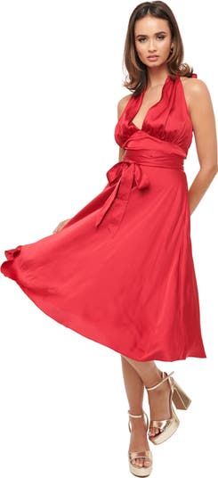 This stunning swing dress features a luxurious fabric that drapes beautifully, ensuring you shine at every occasion. The flattering halter neckline and adjustable self-tie design from the sides make it not only stylish but also incredibly comfortable.