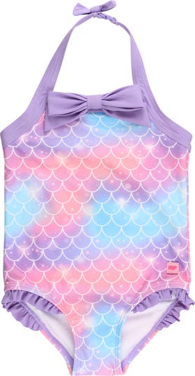 Halter One Piece Swimsuit is the perfect choice for your little girl's next beach day or pool adventure! Designed with a vibrant Multi-Color palette, this swimsuit captures the playful spirit of underwater fantasies. It features a secure halter neck with a convenient clasp closure, ensuring a comfortable fit for all-day play. The ruffle and bow details add a touch of whimsy, making it a standout piece in the collection. Not just stylish, this halter one-piece swimsuit for girls also offers full seat coverage and UPF 50+ sun protection, keeping her safe while she splashes around. Dive into fun with this essential piece of protective swimwear for kids, ideal for those sunny days filled with play and imagination.