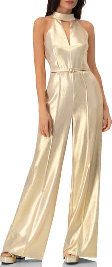 Crafted from shimmering metallic fabric. Featuring a bold keyhole neckline, sleek belt detail, and wide-leg silhouette for an ultra-flattering finish