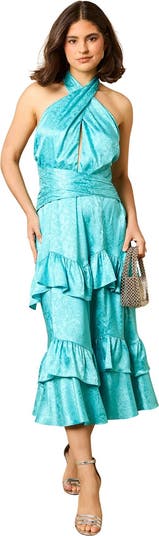 Step into elegance with this Halterneck Satin Jacquard Midi Dress, perfect for making a statement at any occasion.