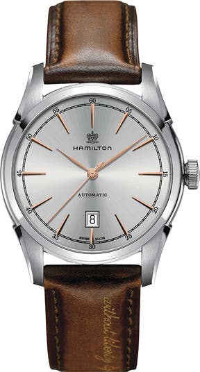 Slender hour indexes accentuate the gleaming sunray dial, displaying the precise, expertly crafted timekeeping of this Swiss-automatic watch. The timepiece is given a touch of patriotism with "without liberty, life is a misery" embroidered on its smooth patina leather strap.