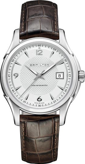 This captivating leather-strap watch lets you take a look at the beauty and precision of Swiss automatic movement at work with its skeletal dial face.