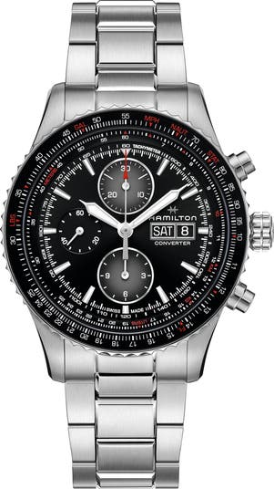 Tap into your inner aviator with this precise Swiss-automatic chronograph watch meticulously designed to look like an aviation control panel. With its rotating bezel and intricate tracks along the border, this functional timepiece allows your to make precise calculations and quick conversions for meters, kilometers and currency.