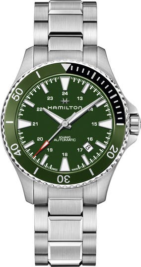 With classic dive watch looks, this Swiss-crafted timepiece makes a splash on land or water and features easy-to-read indexes with 12- and 24-hour markers.