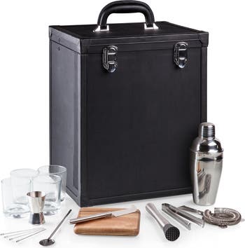 From the Roaring 20s to the 2020s, the Hamilton Bartender Kit is our portable bar case with cocktail shaker set that brings all that jazz back to an anything goes happy hour! This travel bar set is reminiscent of a vintage suitcase with its ballistic nylon & leatherette-accented exterior. The fully-insulated interior of this cocktail case is lined in black velveteen to tastefully showcase your three favorite wine or liquor bottles in padded compartments. The bar set also includes essential stainless steel bar tools: four cocktail sticks, one strainer, tongs, one stirrer, one muddler with plastic head, one double-sided jigger, one cocktail shaker, one paring knife, four lowball glasses, and one Acacia cutting board. This portable cocktail set can be a handsome fixture on your home bar, or help you take your inner mixologist on the road, to the picnic, or on the train. Wherever you go, you'll be fabulous, dahling!