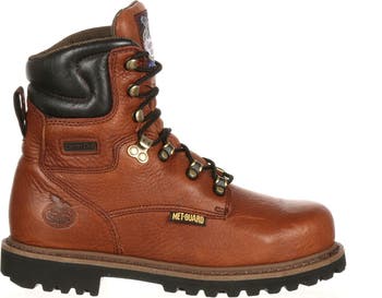 Georgia Hammer Internal Metatarsal Comfort Core Steel Toe Work Boots: The full-grain leather that was utilized on the upper of these Georgia Hammer work boots looks incredibly masculine, has outstanding hardiness and is incredibly smooth to the touch. The leather collar has been padded twice, this allows it to provide superior cushioning and it will prevent these boots from digging into the back of your legs. Another great feature on the upper of these work boots is the lace-up design; because of this feature, it is possible to change how tight or loose the bootlaces are fastened, which basically allows you to modify how these boots fit. The steel toe that has been constructed into this 8 work boot is able to withstand up to 75 lbs. of impact and compression; it complies with the ASTM F2413 I/75 C/75 Protective Toe Classification. As an alternative to the inflexible met-guard that you are used to wearing, this men's work boot has been made with ANTImpact; this internal met-guard still provides fantastic protection against falling objects, but since this is an incredibly soft material, these boots will be much more comfortable to wear. If you work around a great deal of electrical equipment, . the fact that these men's boots have also met the ASTM F2413 Electrical Hazard Standard. You are adamant that the exterior of your work boots should be durable and that the interior must be comfortable; these Georgia work boots certainly deliver. Your legs will be enclosed in utter softness, because these boots have been fully lined; the