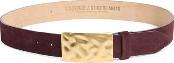 This suede belt features high-shine hardware that's given organic texture with an undulating hammered finish.