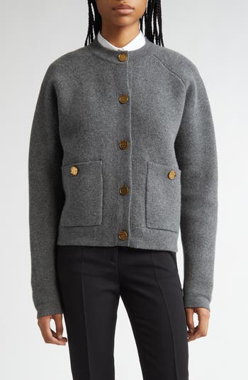 This refined cardigan, highlighted by hammered goldtone buttons on the placket and pockets, is imagined from a wool blend with a hint of cashmere and boasts a spongy, double-sided construction for warmth and softness.