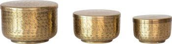 - A stunning set of three round containers that feature a hammered debossed design and an antique brass finish