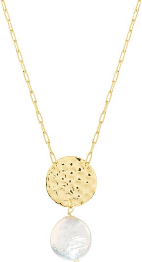 A lustrous coin pearl dangles from a hammered disc in this delicate chain necklace that brings contemporary elegance to your look.