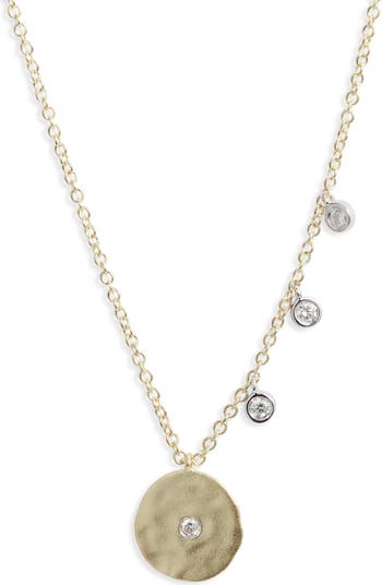 A round-cut diamond centers a hammered disc pendant, lending artisanal flair to a 14-karat yellow-gold necklace detailed with a trio of sparkling shakers.