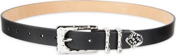 Gleaming, high-shine hardware is softened with an undulating hammered finish to add intriguing texture to this belt crafted from fine, smooth leather.