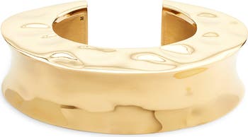 A concave silhouette is dimpled with a hammered finish to give sculptural appeal to this bold cuff bracelet.