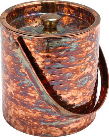 - A round, double-walled stainless steel ice bucket featuring a hammered texture and oxidized copper finish for Vintage appeal