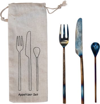 This appetizer set features three different utensils that are designed to enhance the dining experience. Each utensil has a hammered texture that adds a rustic charm and a burnt grey finish that creates a sophisticated contrast. If hosting a party, having a family dinner, or enjoying a snack, this set will help serve and savor favorite appetizers with style. The set is made of stainless steel that is sturdy and safe for food contact. It also comes with a printed drawstring bag that makes it easy to store and transport. This appetizer set is a great gift idea for anyone who loves to entertain or appreciate fine tableware.