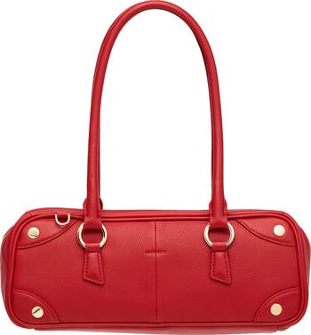 Aged-finish hardware and richly textured leather highlight the barrel-inspired profile of a structured bag featured a pair of rolled shoulder straps for easy wear.