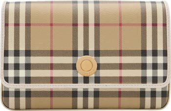 A compact bag made from a coated cotton blend, printed with the Burberry Check and lined in cotton. The design is trimmed with topstitched calf leather in a tonal colour and has a logo-engraved closure. Detach the strap to switch from a crossbody bag to a clutch.||Detachable, adjustable leather strap|Foldover flap with magnetic closure|Interior slip pocket|Hand-painted edges|Polished metal hardware|Cotton lining|Comes with a dust bag