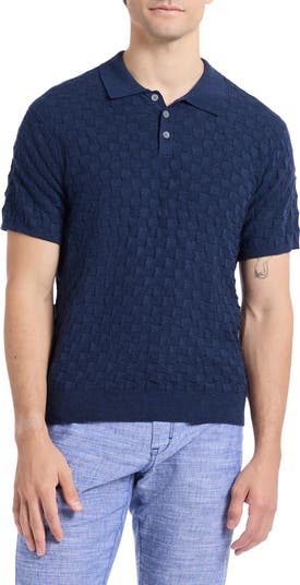 A basketweave-inspired textured knit is highlighted by subtle color variations in a lightweight cotton polo sweater fashioned with a classic button placket.