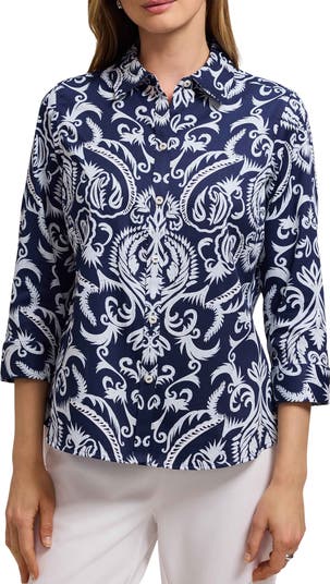 A swirling damask print emboldens this polished shirt cut from crisp poplin and framed by three-quarter sleeves.