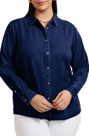 Soft denim brings versatility to this polished button-up shirt framed by long sleeves and punctuated with a tuckable shirttail hem.